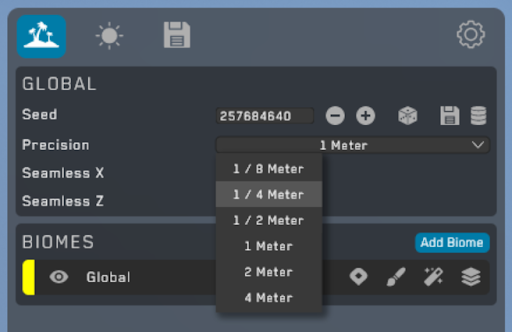 The default Precision settings in World Creator will produce low resolution textures when exporting. To increase the resolution, go to the Global panel and choose the desired value from the Precision drop down. 1/4 Meter produces maps with a resolution of 8192 x 8192, for example. This is a good size for typical uses. All other settings in the Global panel can remain as they are, unless you have a specific need to adjust them.