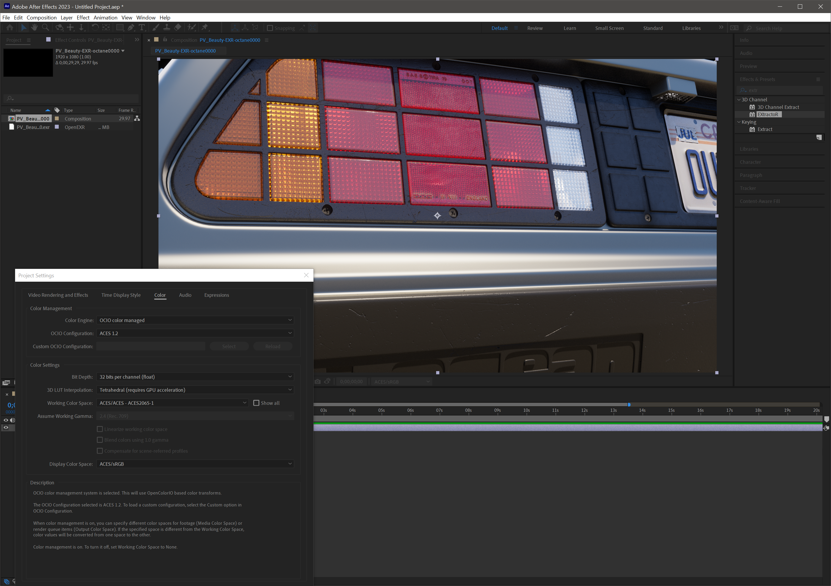 Adobe has recently updated After Effects (version 23.1.0) to support OCIO without plugins (EXR support still requires an external plugin). In Project Settings, choose the ACES option. There are additional opens in the View menu to choose display transform options. See the After Effects 2023.1.0 documentation for more information.