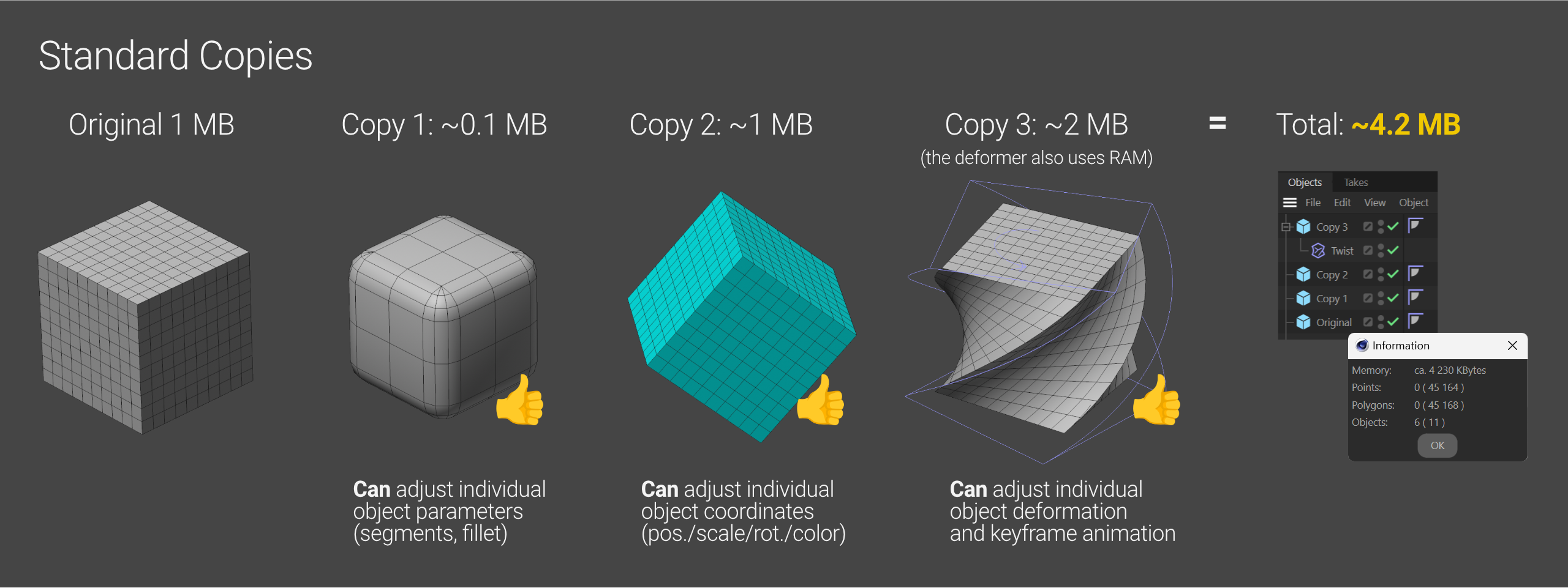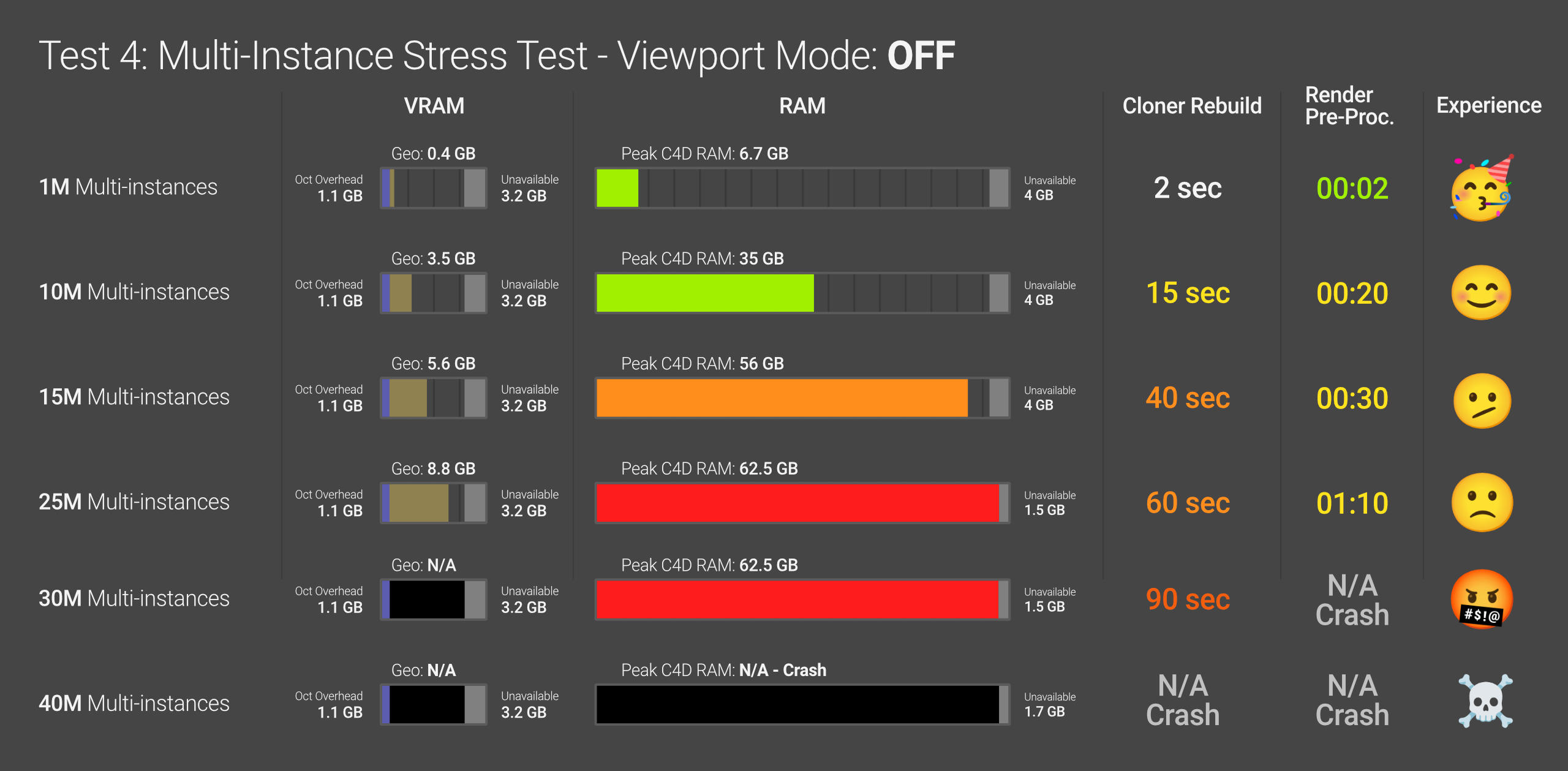 VRAM: The cloner structure itself takes up VRAM, but it’s not until we get into the millions of instances that this becomes an issue. The source geometry is only loaded once into VRAM during a render which allows for a lot of very complex instances.