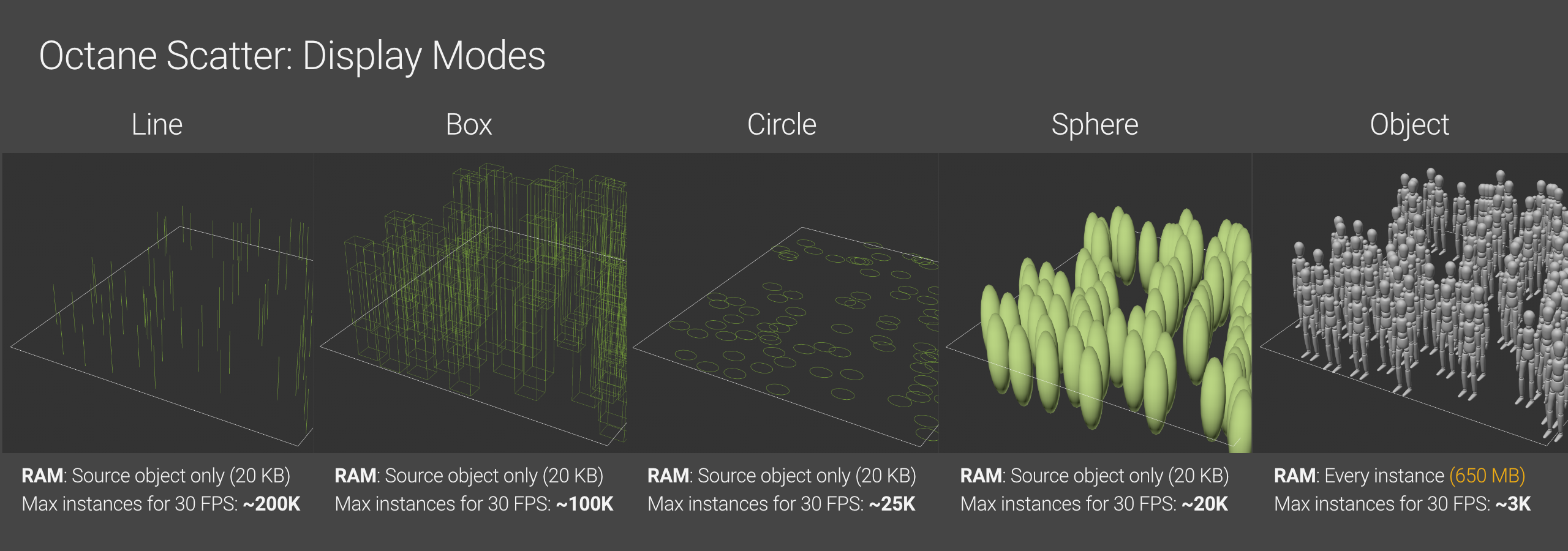When Line (default), Circle, Box, or Sphere is chosen, Scatter loads the source geometry into RAM and VRAM only once like the cloner in Multi-instance mode. This means the source object can have millions of polygons and not cause problems. The maximum number of visible instances in Line mode on this computer before we drop below 30 FPS is about 200k. Box, Circle, and Sphere modes become increasingly heavier on the viewport, and fewer of these can be shown.