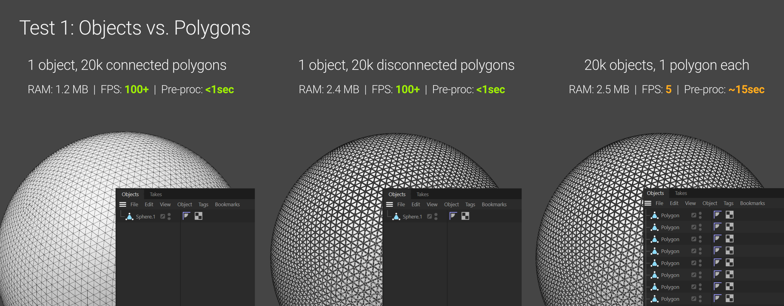 1 object, 20k connected polygons: First off, let’s take a look at how Cinema 4D handles individual objects vs polygons. If we make a sphere, set it to Icosohedron mode so it produces triangles, change the segments to 160, and hit Ctl-I, we’ll see that it produces 20,480 triangles and uses 1.2 MB of RAM. It doesn’t matter if we make this editable or leave it procedural - it’s uses the same amount. Our FPS is well over 100, and it takes no time to render. Based on the polygons guide, this is no surprise.