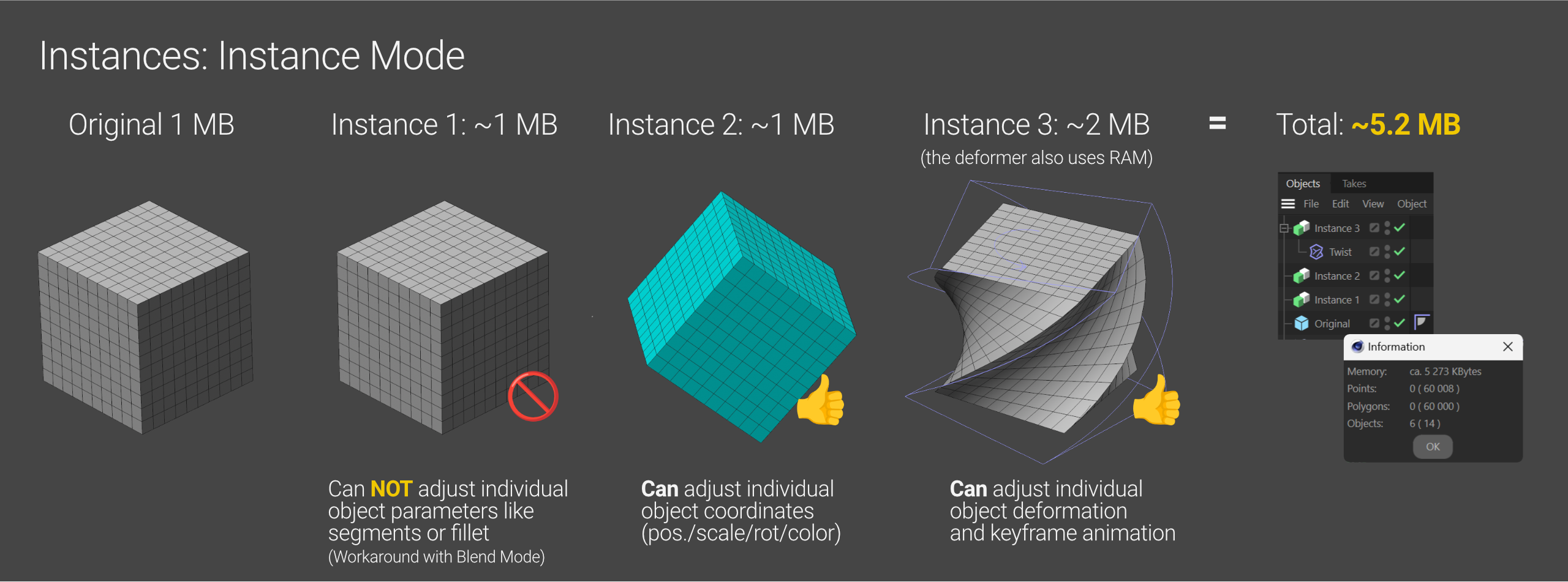 RAM: In this mode, the total amount of RAM is determined by the source object. If the source object takes 1 MB and there are 10 multi-instances, the system only uses 1 MB. If there are a million multi-instances, the system still only uses 1 MB.