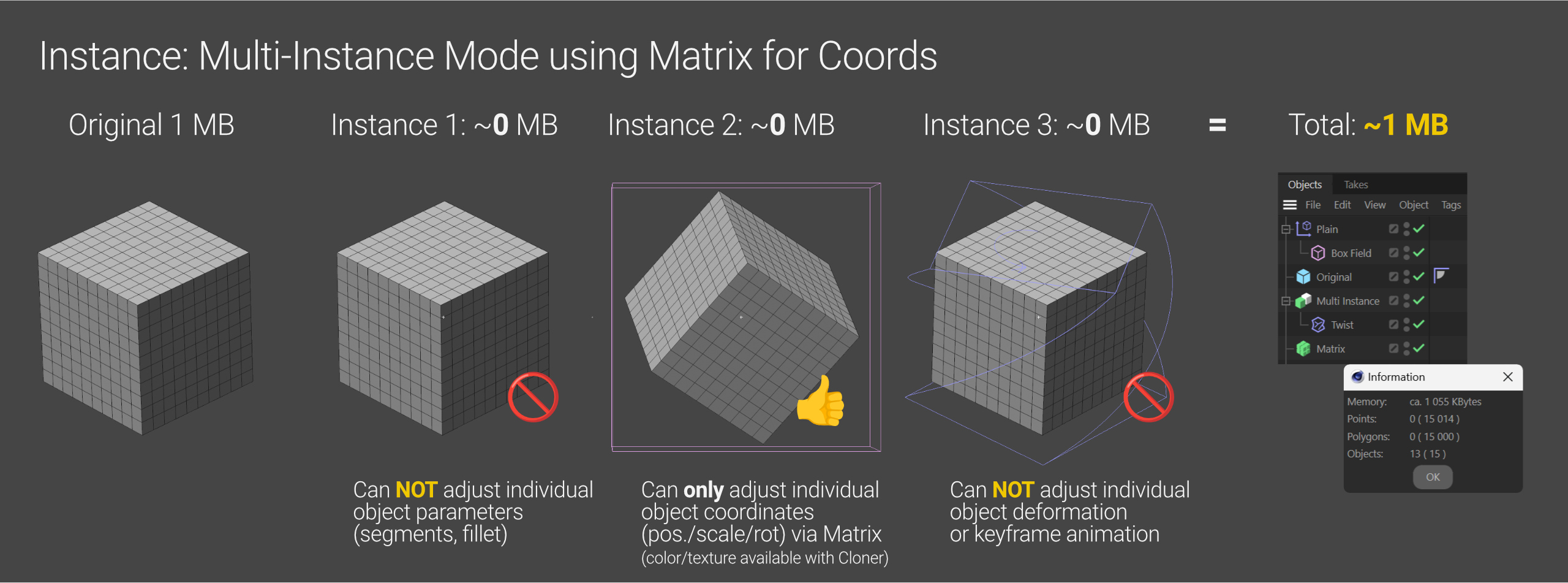 C4D itself uses far less RAM for a multi-instance cloner than a regular instance one. If we Ctl-I again. Instead of 3.7 megabytes, C4D is only reporting that we’re using 1 kilobyte of RAM! C4D is treating all the Multi-Instances as virtual copies and not real geometry, so this whole thing with all 30k instances is only taking up as much RAM as our single source object.