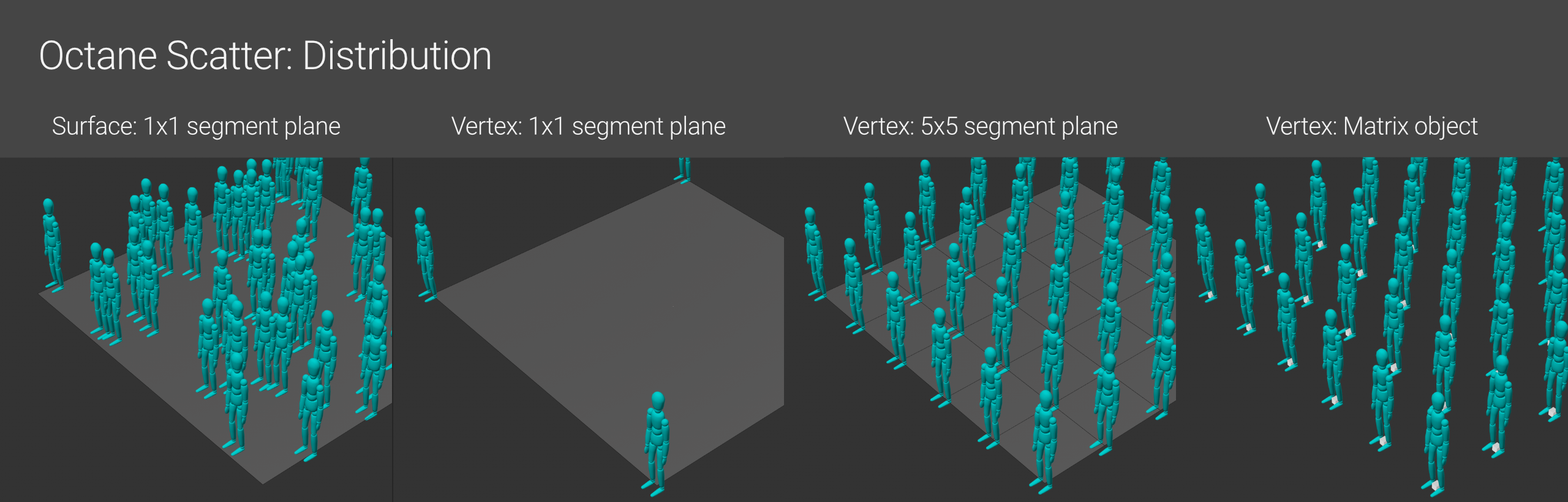 The most efficient possible surface for a Scatter is a single polygon, though any piece of geometry with even a few thousand polygons won’t add any noticeable impact. This uses virtually no resources by itself, and Scatter can randomly place millions of instances across the face of that object when the Distribution Type is set to Surface. This means we’re only limited by how many instances our card can handle and how long the Scatter itself takes to build or copy into VRAM - we don’t also have to wait for a large Matrix to build itself and calculate during a render. The downside is that we don’t get a nice neat grid this way.