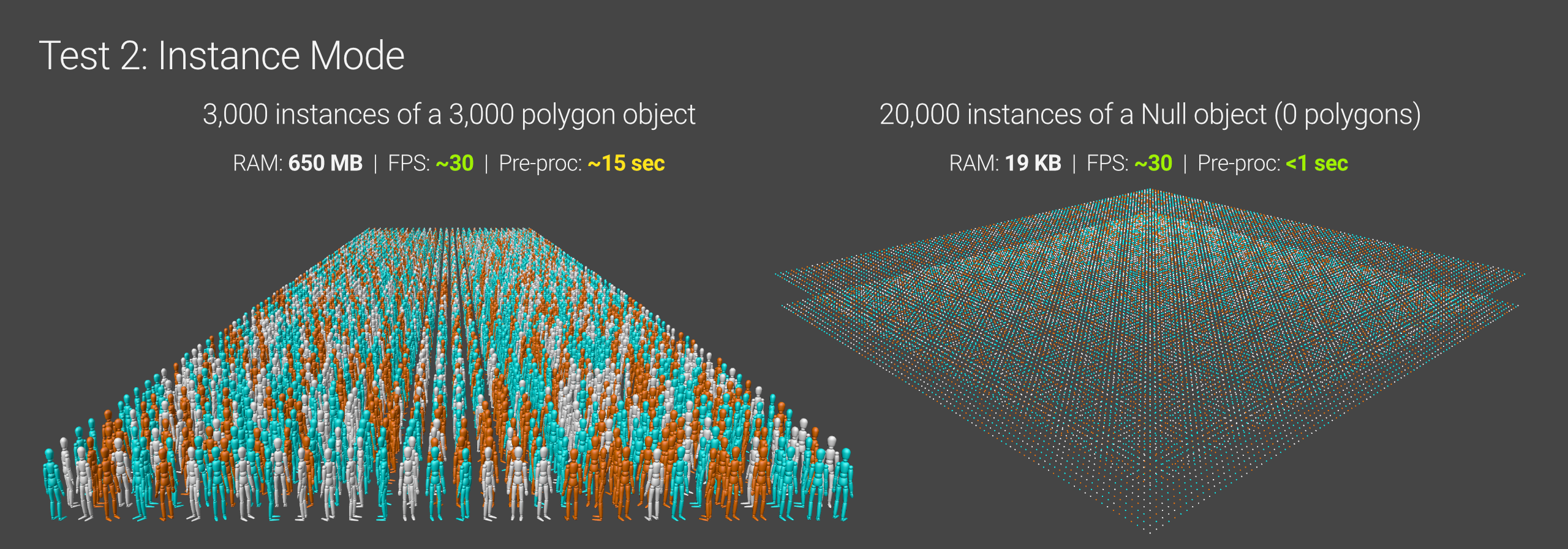 20,000 nulls can still be shown in the viewport in Instance mode in real-time. What’s the point of this? If we absolutely needed Instance mode because of some limitation with Multi-instance or Scatter that we couldn’t work around, and only needed to visualize the position of each clone, we could set up and time our animations using the nulls, and then swap them out for our real geometry prior to render.