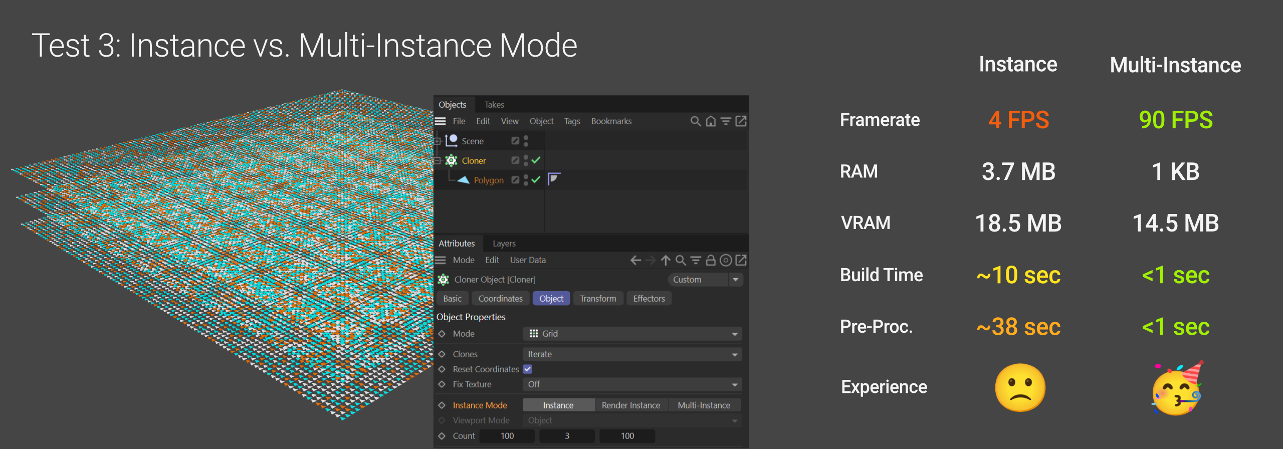 Let’s take our 100x3x100 (30,000 instance) cloner with a 1 polygon source object from the previous test, head over to the Object tab and set it to Multi-Instance.