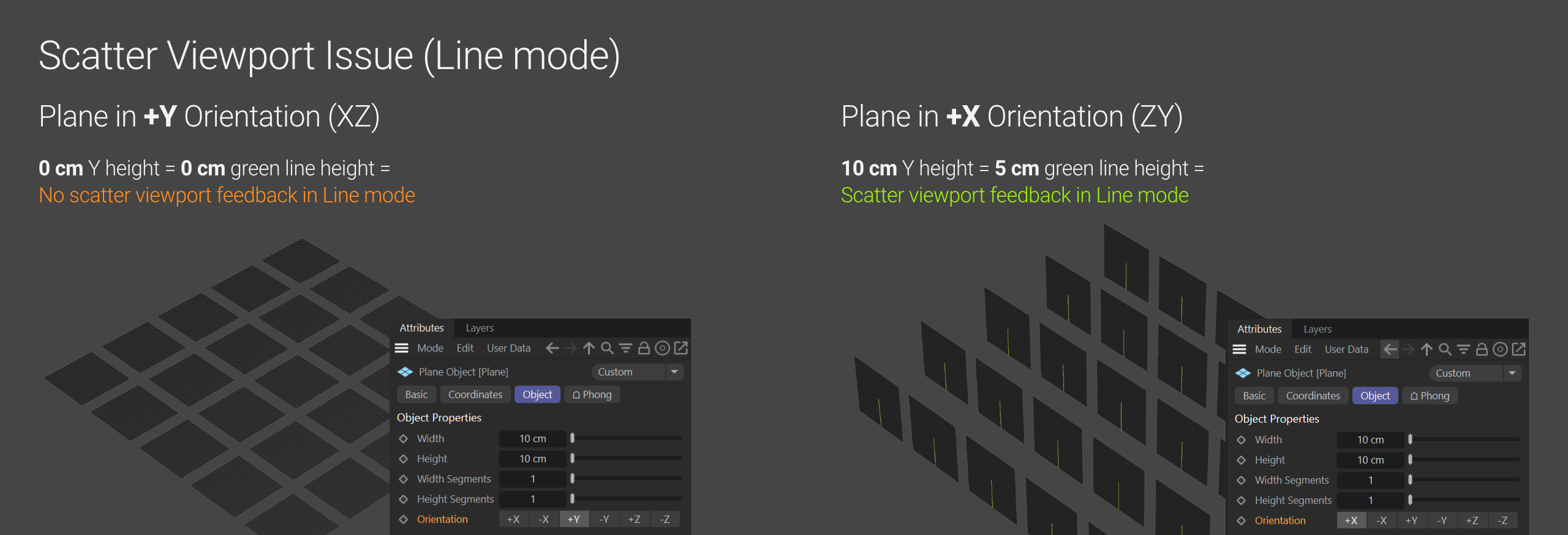 2. This is more complicated. By default, Octane Scatter represents each instance as a vertical line. This line shows half the height of the instance. Right now, what we’re cloning is a plane that’s in the +Y orientation (also known as XZ). It’s a single polygon, so while it’s 1cm wide (x) and 1cm deep (z), its height (y) is zero. So the scatter is showing its vertical lines at 0 cm each, or as we like to think of it... nothing.