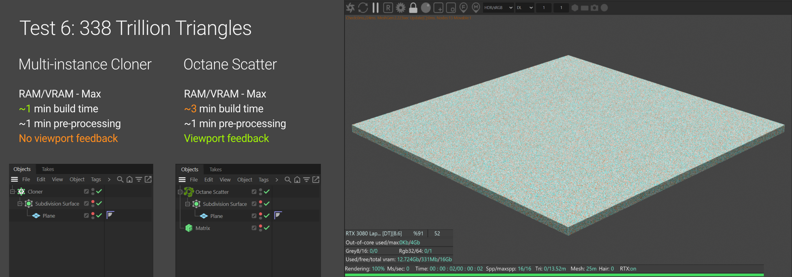 Scatter takes a little bit longer to build than a Cloner in Multi-instance mode with the same number of clones if both are hidden from the viewport, but both can be pretty substantial as we get over 5 million instances.
