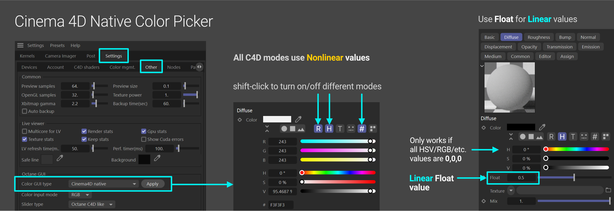 Octane gives us the option in Settings (gear menu in the Live Viewer) of choosing the C4D color picker. This gives us a number of other color models that produce nonlinear values. These are the models we’re used to like hex values, 8-bit sRGB sliders, swatches, and a few other rando ones like Kelvin or mixer. This is what we want when we’re picking Diffuse/Albedo/Color channel colors.
