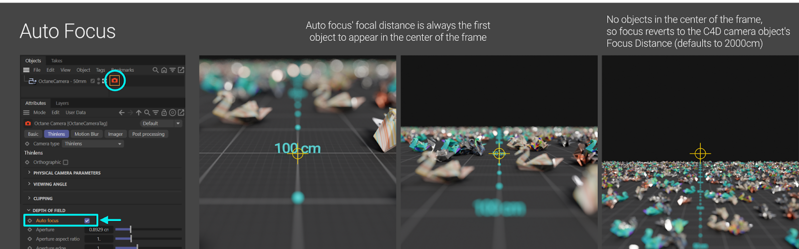 By default, Auto Focus is turned on in the Octane Camera Tag. This works similarly to the auto focus setting in a real-world camera when it’s set to fixed center point mode. It basically projects a perpendicular line from the center of the sensor out, and the first thing it hits sets the focus distance. As we move the camera around, the distance changes depending on what’s now the center of the frame. If the camera is aimed at an area of the scene where there are no objects, the focus distance will revert to the value set in the C4D Camera Object’s Focus Distance setting.