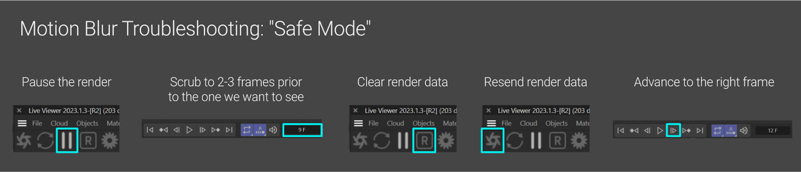 First, stop the render using the pause button. Then jump or scrub to a few frames before the frame we want to see. Then hit the R button to clear all data from the GPU. Then hit the Send Scene button (Octane logo icon) to resend all the data and rebuild the motion blur cache. Then hit the Go to Next Frame button a few times to get to the right frame while Octane is running.
