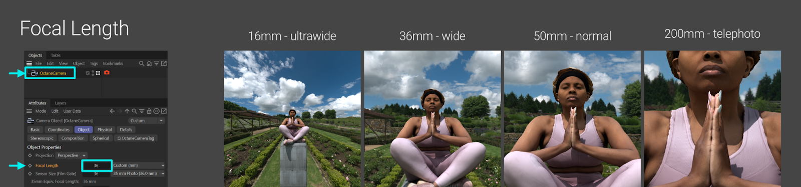 This is set in C4D’s Camera Object settings, not in the Octane Camera Tag. This controls magnification, and background compression. 50mm is closest to what the human eye sees. Wider lenses (smaller focal length values) are for landscapes and epic scenes with more stuff in them. Longer lenses (larger focal length values) are for portraits and isolating a single subject. This should be set early on as it affects the composition of the scene quite a bit.