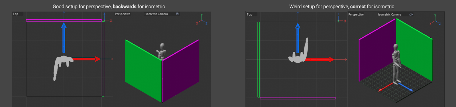 Quirky behavior: In C4D, the Top viewport is turned 180 degrees from what we’d expect when using an Isometric camera. Objects that face “up” in this view are facing the camera, where we’re used to seeing the opposite happen with a perspective camera. The isometric camera is a fixed angle, so if rotation is desired, the objects have to rotate in relation to the camera, not vice-versa.