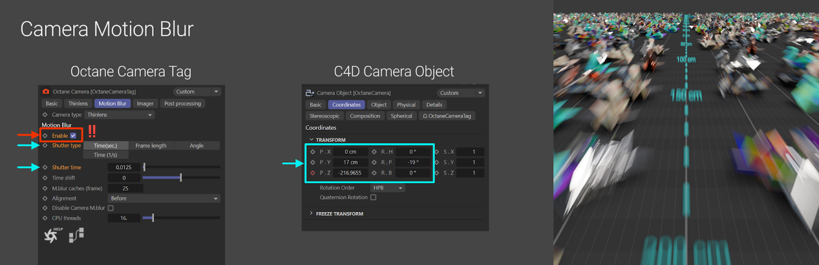 2. Turn on Motion Blur for the camera. In the Octane Camera tag, we need to make sure motion blur is enabled and “Disable camera m.blur” is left unchecked. We need both camera and object blur enabled for this to work.