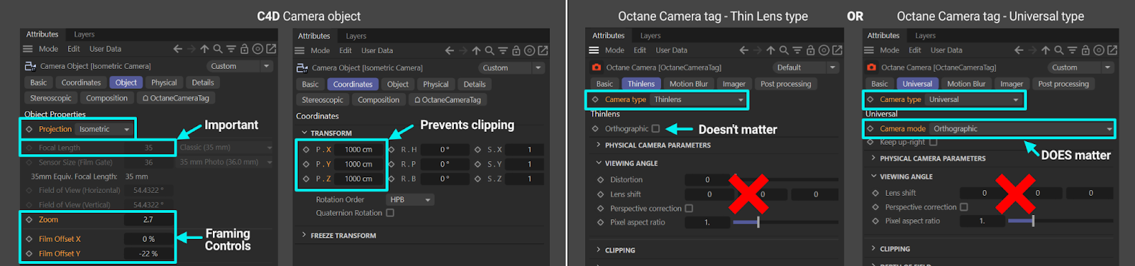 Set the C4D Camera Object’s P.X, P.Y, P.Z coordinates to the same value. That value needs to be larger than the coordinates of the bounding box of all the objects or clipping will occur. The value doesn’t affect framing if all three are the same, so start with 1000 cm for P.X/P.Y/P.Z to be safe and adjust as needed. Camera rotation values do not matter since isometric is a fixed angle.