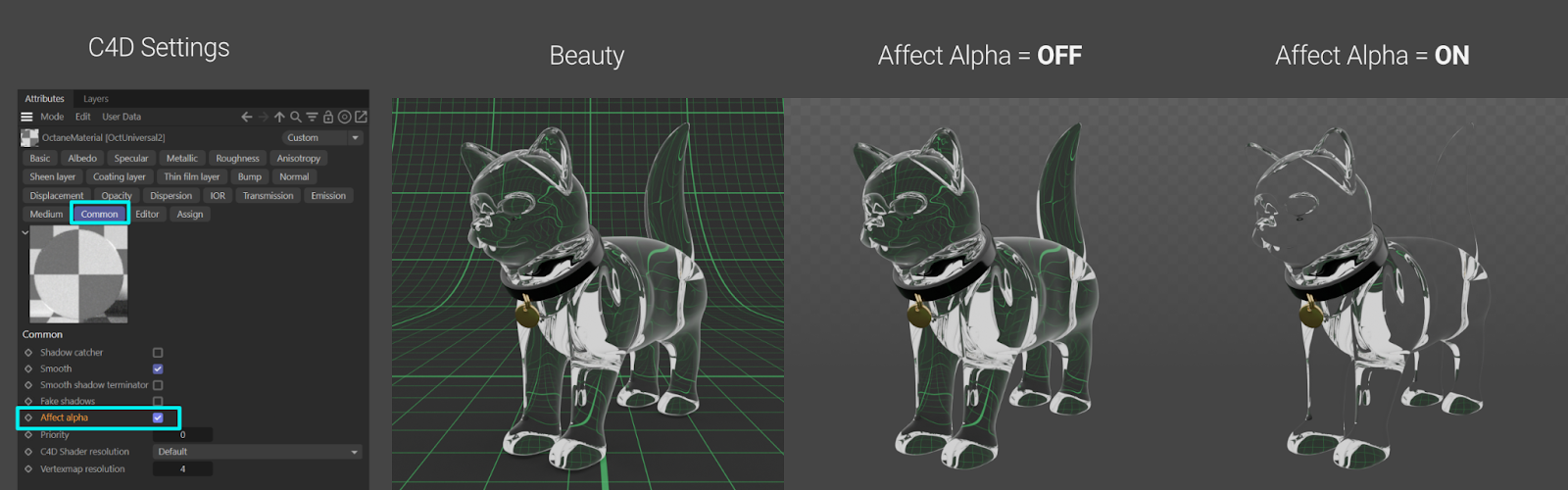 Recent versions of Octane allow us to punch out some of the translucent areas of the render for easier compositing. This setting is a simple on/off checkbox in the Common tab of the material called “Affect Alpha”. It’s a material-wide setting, and there are no options for it like threshold or anything else.