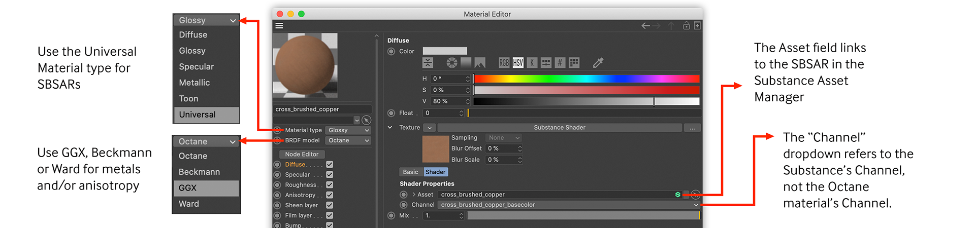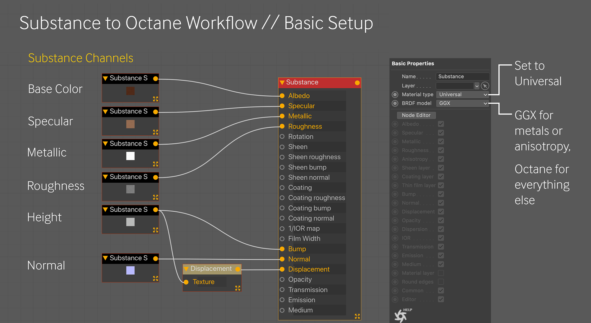This file uses the Octane Universal Material, which is perfect for Substance files. For more info on the Universal Material, find the Universal Material guide.