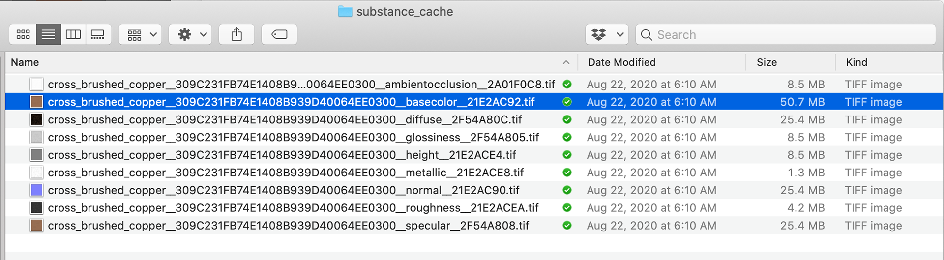 Cross Brushed Copper generates 9 maps. If we want to see what they all are, we can select the cross_brushed_copper SBSAR asset and then in Attributes manager, scroll all the way down to the bottom and we can see what those maps look like and what they're called.