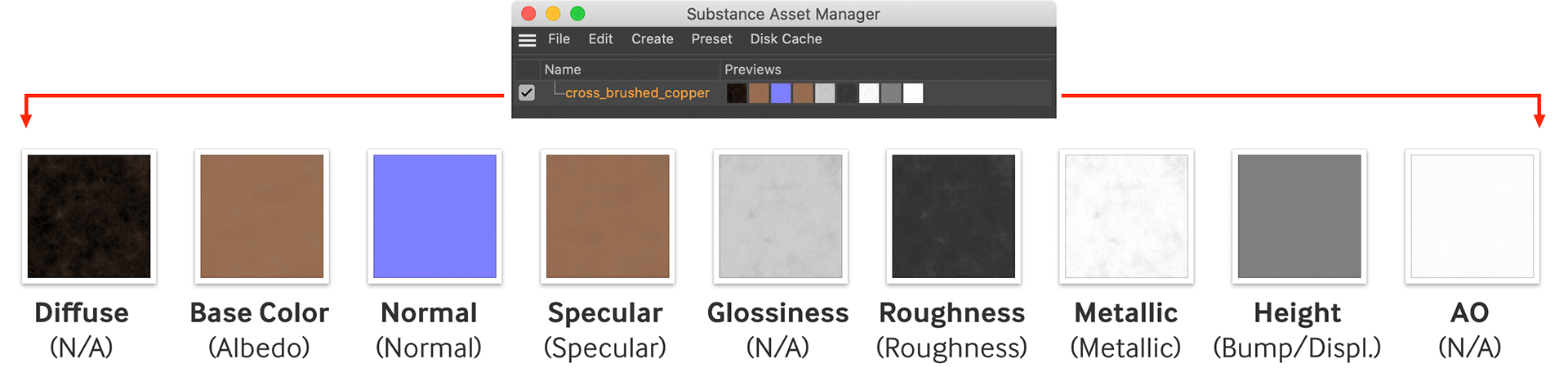 What came over from the auto-generated material was a Base Color map (correctly routed into the Albedo channel), a Normal map (correctly routed into the Normal channel), and a Height map (which is for both Displacement and Bump). If you click on any of the Substance Shader nodes, you'll see which channel they're set to. This SBSAR has a lot more channels, though, and looking at the Substance Asset Manager gives us a clue as to how many.
