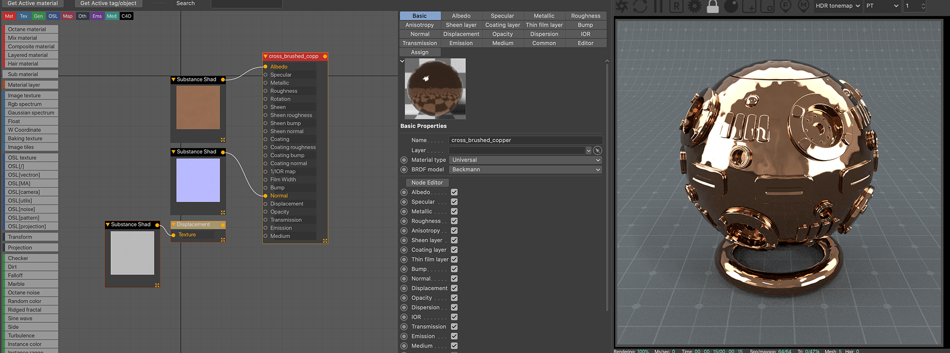 The first thing you need is an SBSAR file (not SBS - that's something else). You can get some free ones to test out at Substance Source, Substance Share, or CC0Textures. Then, if you want to follow along, and don't want to scroll allll the way back up to the top of the page, you can grab my file here. I'm going to use Cross Brushed Copper (free) from Substance Source in this example.Next, let's drag the SBSAR into it from Finder or Explorer (or File>Load Substance from the Substance Asset Manager). It will automatically create a standard C4D material from it. Select the C4D material, and then choose "Convert Materials" from the Octane Live Viewer window, under the Materials menu (toward the bottom). This will generate a crappy Octane material that we have to fix now.
