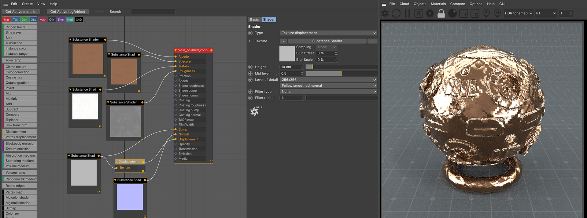 So that's it for the basics. If you made it this far, you probably have a good understanding of how Substances work with C4D and Octane. From here, you can do all kinds of cool stuff like use the various maps in ways the creators never intended (try throwing the Height map into a Texture Emission for fun). If you decide that you're totally happy with the maps and you want to do more advanced stuff in Octane's node editor, you can simply replace all the Substance nodes with Image Texture nodes and use the cached versions of the maps. Then you'll have access to the Transform and Projection nodes again.