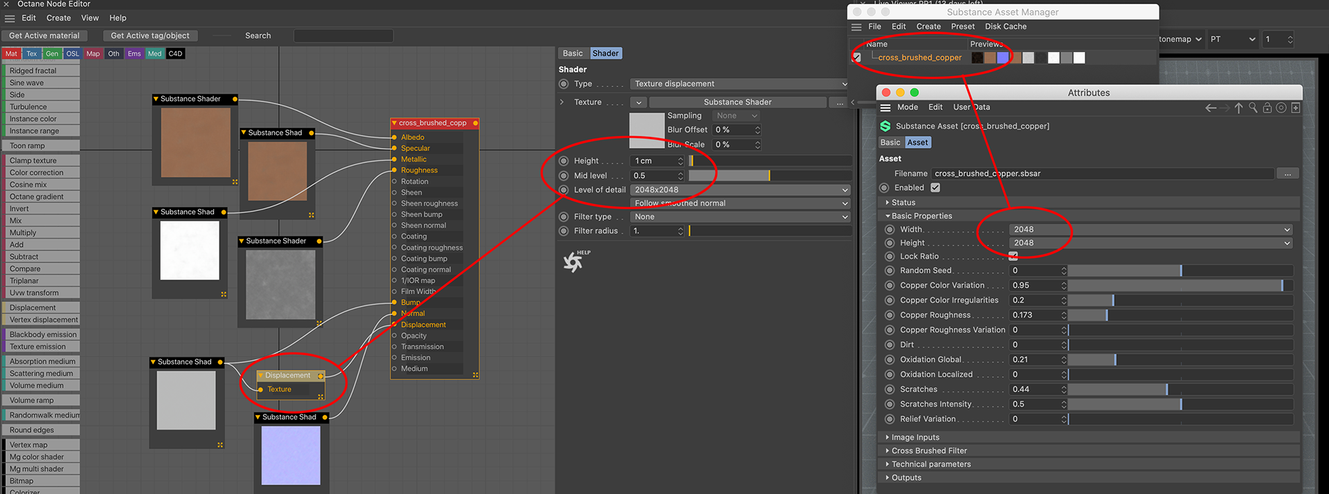 First off, Substances come into C4D at 256x256 by default. It's really fast to generate new maps, but with fine details (especially in displacement), it's going to look terrible. By clicking the Substance in the Asset Manager, we can go into the Attributes manager and change either Width or Height to 2048. Lock Ratio is on by default, so it will change the other one for us.