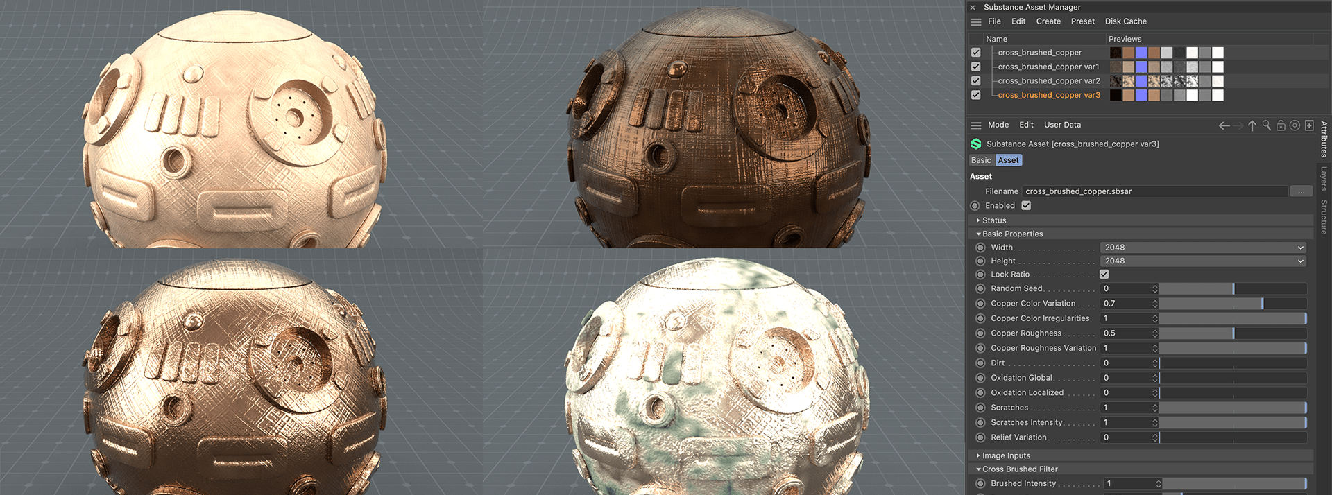 Voila - that's looking good. So now we can start changing the exposed parameters and get some variations going. For this, you want to make new instances of the SBSAR in the Substance Asset Manager. Then make copies of the material, select all the nodes, and drag the new instance of the SBSAR into the Asset field to link to that. Now when all the parameters are altered, it won't mess up the original.