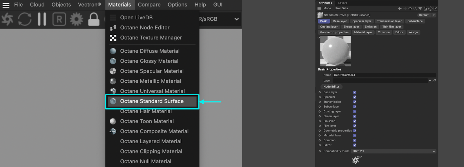 Like all other Octane materials, the Standard Surface material is found in the Materials menu in the Live Viewer.