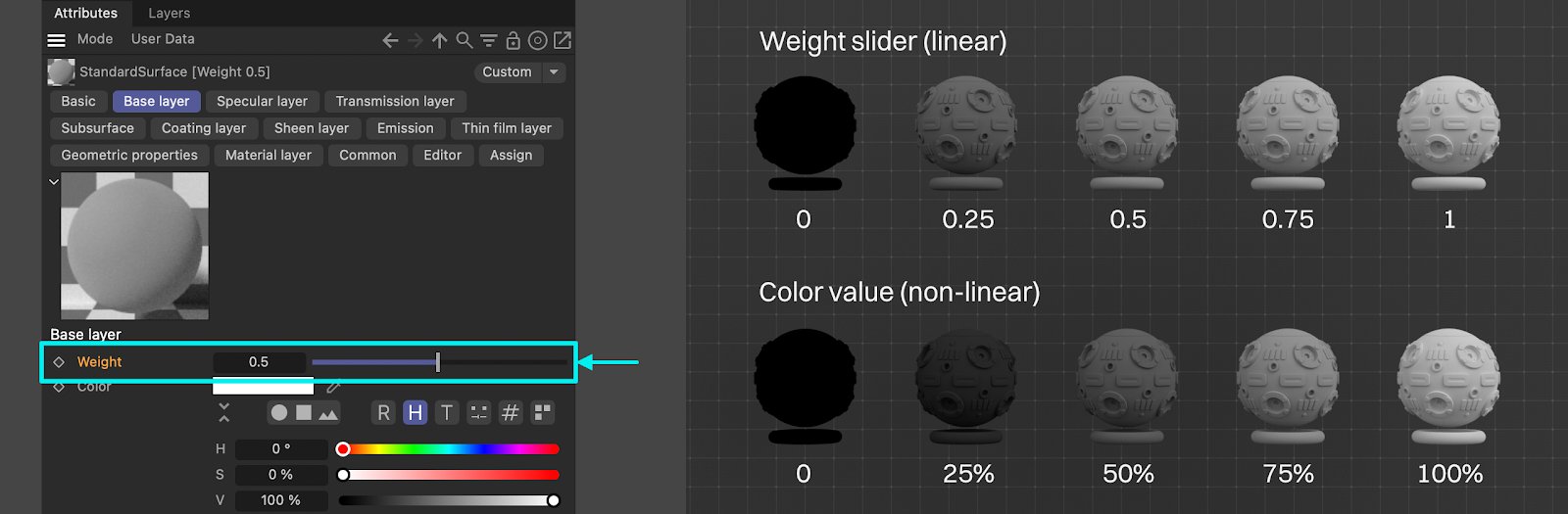 Important: The weight slider is linear. This is a whole involved topic, but for now we just need to know that this means the results will look different if we’re adjusting the weight slider vs making the material color darker (as we can see above). It’s a good idea to set the weight slider to 1 for most layers where color values are involved (like the base layer) and then just use the color controls to darken it.
