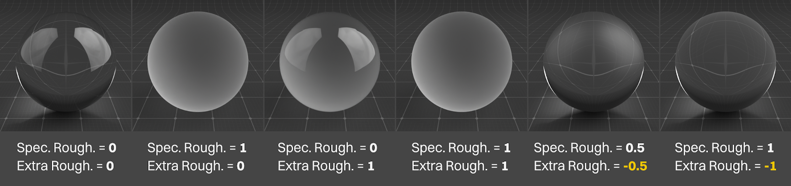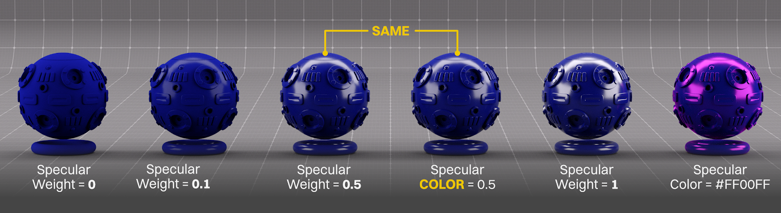 We can still also set the reflection intensity using the color if we want, as we see above: One of the shaderballs is set to a white specular color with the weight at 0.5, and the one next to it has the weight at 1, but the color at 0.5 (float texture piped into the color pin set to 0.5). The results are identical.