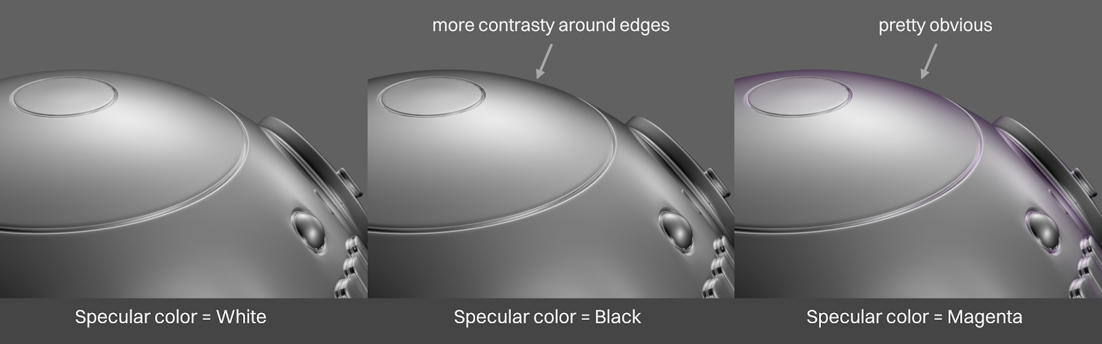 When we go from white to black, the difference is there, but it’s super subtle - the metal just looks a bit more contrasty overall around the edges. When we change it to a non-gray color, it becomes a lot more obvious like the magenta in the illustration above.