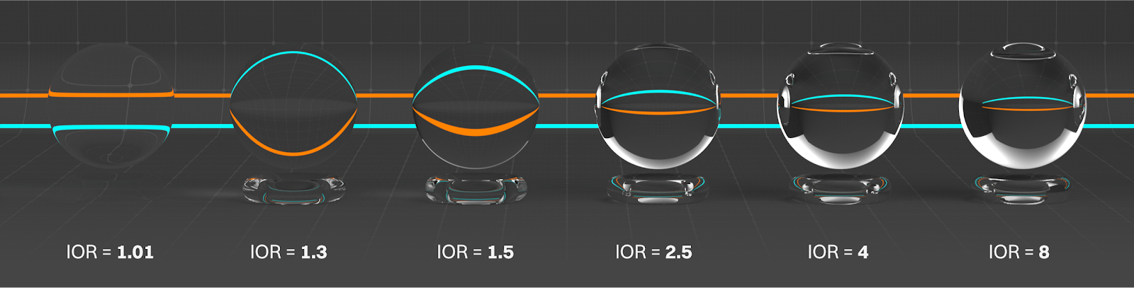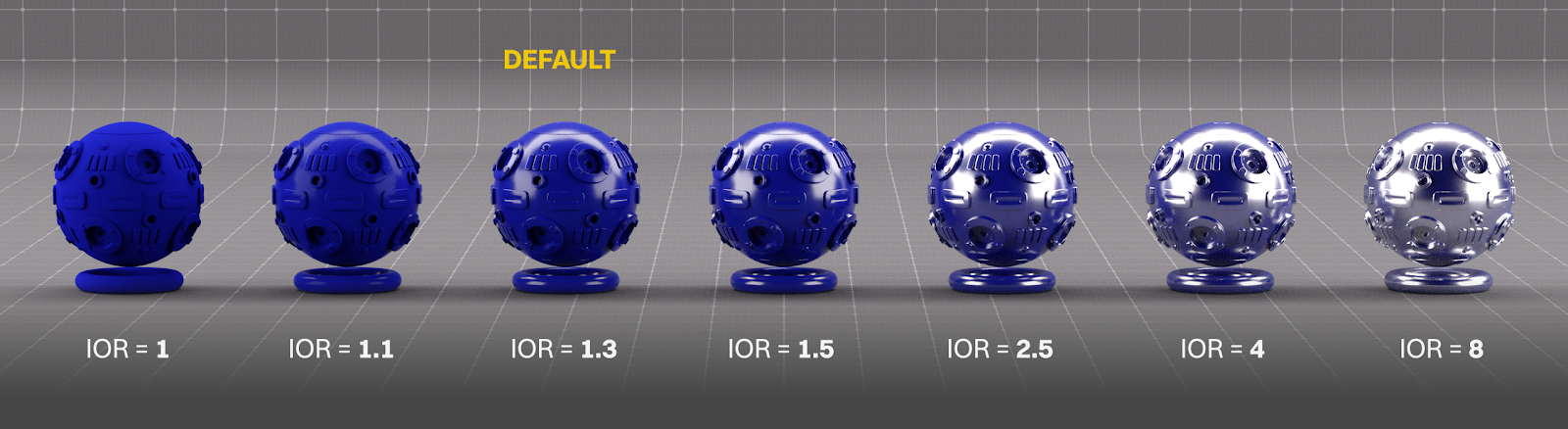 IOR (stands for Index of Refraction, and is sometimes just called Index) affects both the Specular and Transmission channels. In the Specular channel, it makes the material more glossy. Realistic values usually go up to 3 or 4 - anything past that, it’s better to crank the metalness if we’re after realism.