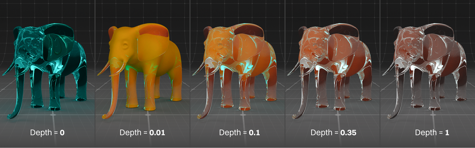 The 0-1 float slider adjusts the opacity of the entire object. This is good for a hologram or a fade transition. Unlike Photoshop, we start seeing the back side of the object through the front side as we reduce the opacity, so there are some interesting effects that can happen here.