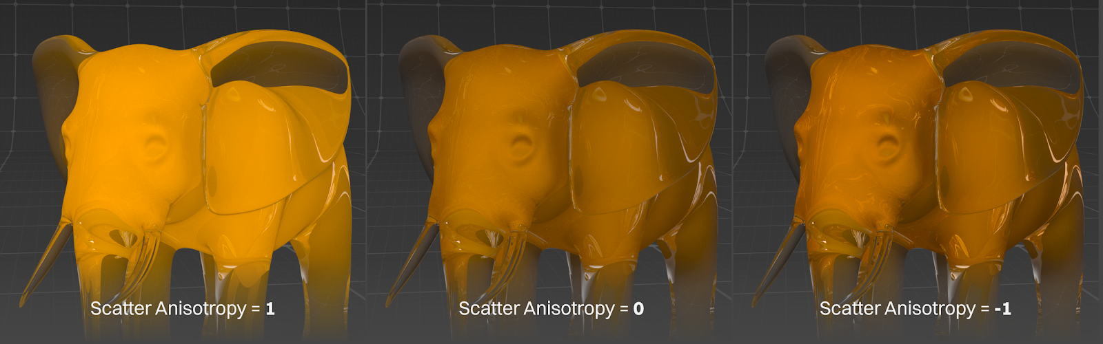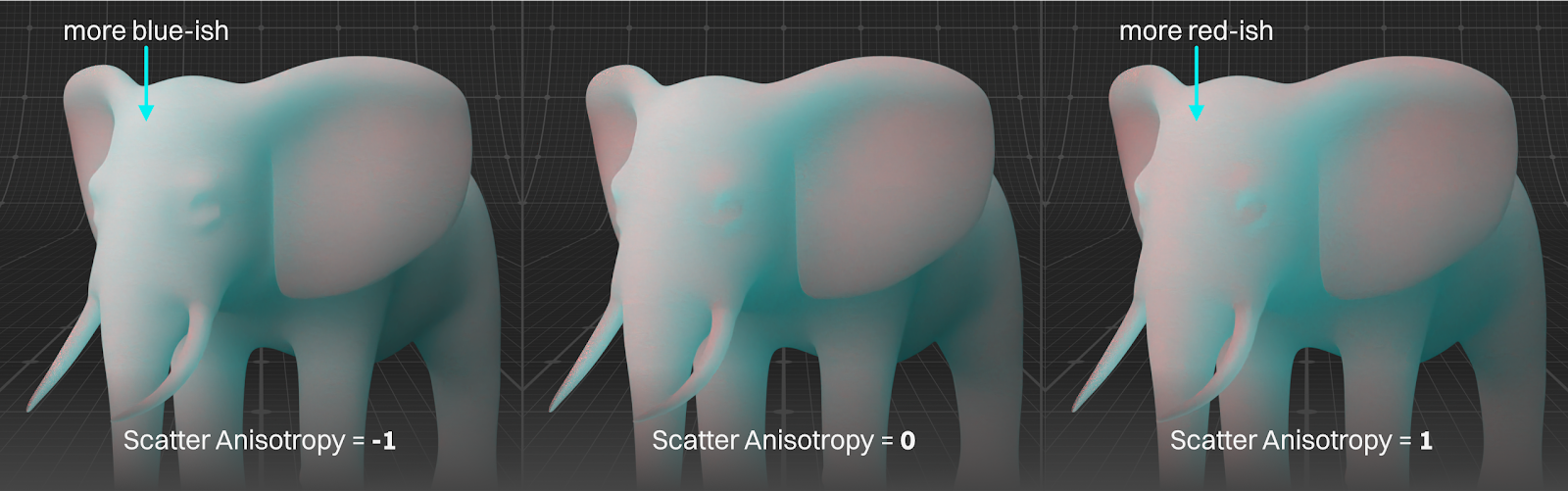 Similar to Anisotropy in Transmission, this is a very subtle effect that changes the odds of rays scattering back toward the light source (-1) instead of keeping on in the direction they were going (+1). Usually this is best left at 0 for a reusable material, and then adjusted per model if there’s a tricky lighting situation.