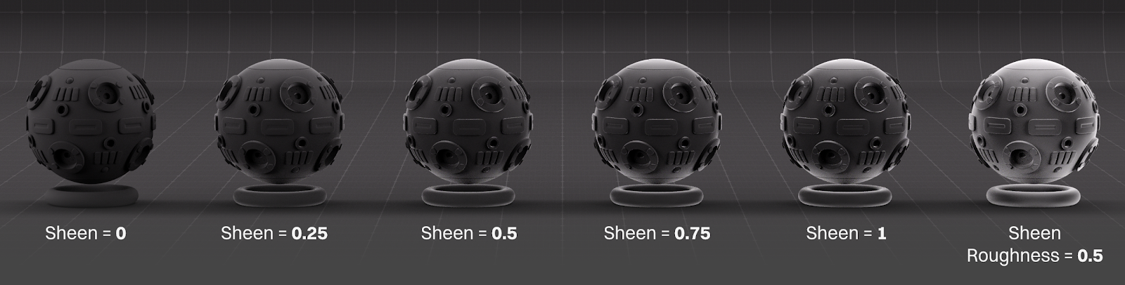 - Sheen then sits on top of Base/Subsurface and adds to the ones below, allowing for satin-looking diffuse/subsurface materials.