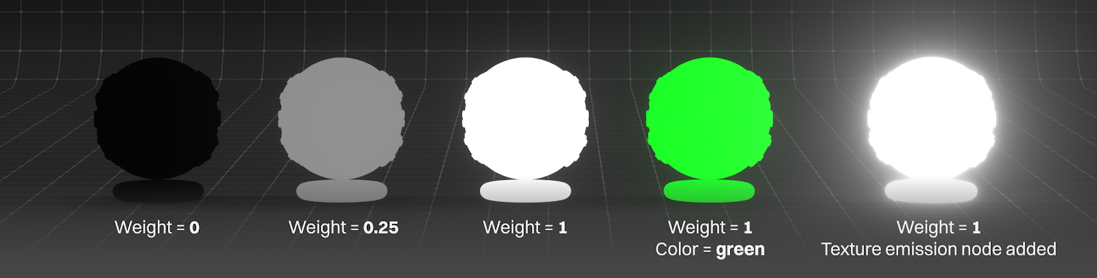 Important: This internal emission node is MULTIPLIED by the external Blackbody or Texture Emission node we feed into the Emission pin. If the Weight slider is at 0, or if the built-in Emission color is black, there will be no visible emission even if our external emission node is cranked up to a million (fun fact - it actually goes to a million, and there probably is no reason to ever do that).