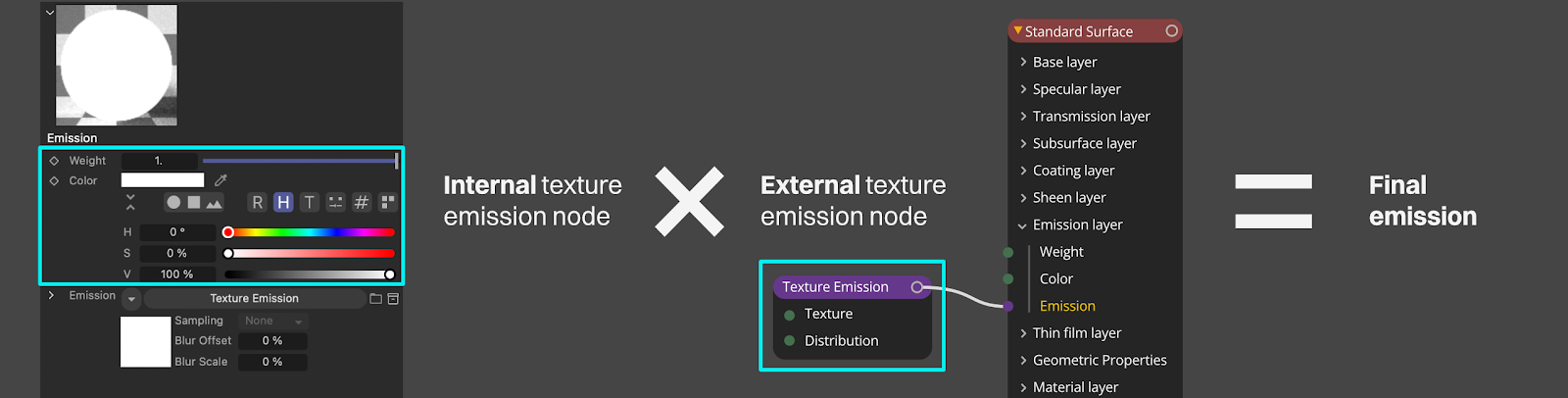 In the Standard Surface material, there is a 0-1 Weight slider like the rest of the layers, but in this case it applies an internal texture emission node with a power of 1 and surface brightness on. This will emit some light, but it’s a pretty weak effect because it can’t go above 1.