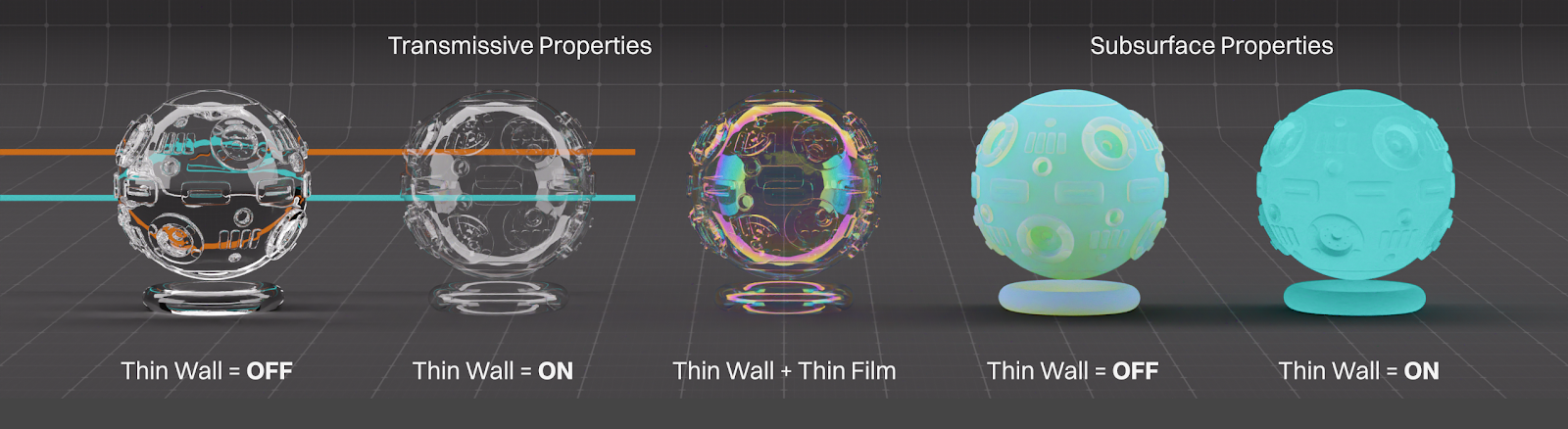 When used in combination with Transmission, IOR and scattering are ignored. This creates a material well suited for super thin transparent objects like blown glass ornaments or soap bubbles (thin wall + thin film + coating does a nice job with this as seen above). This is similar to the Thin Wall Specular transmission type in other Octane materials.