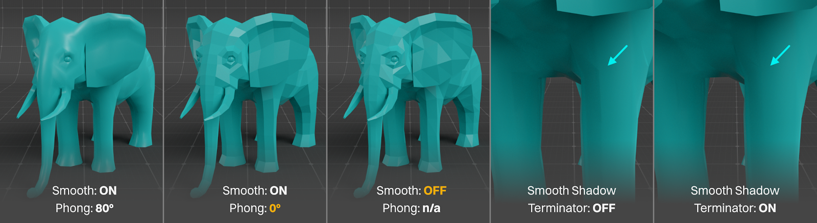 Smooth (on by default) follows the Phong angle and smooths out low poly geometry. If we reduce the model’s Phong angle to 0 (in the Phong tag in C4D or elsewhere in other DCCs), it gives us a faceted look based on the actual geometry (quads in the example above).