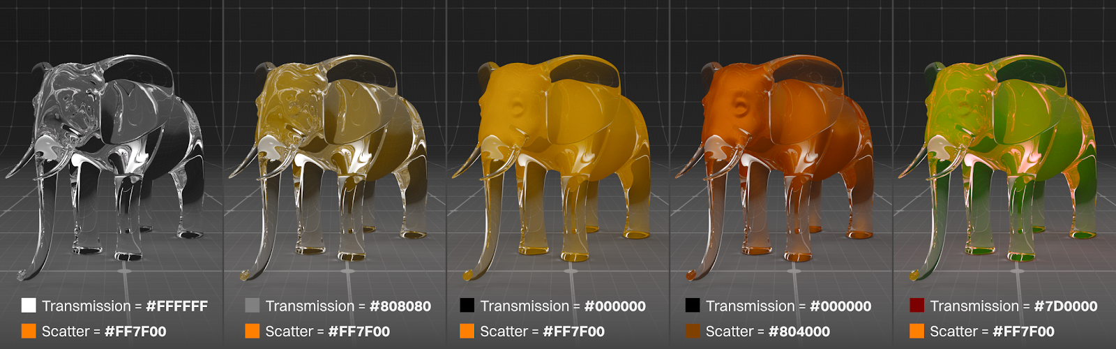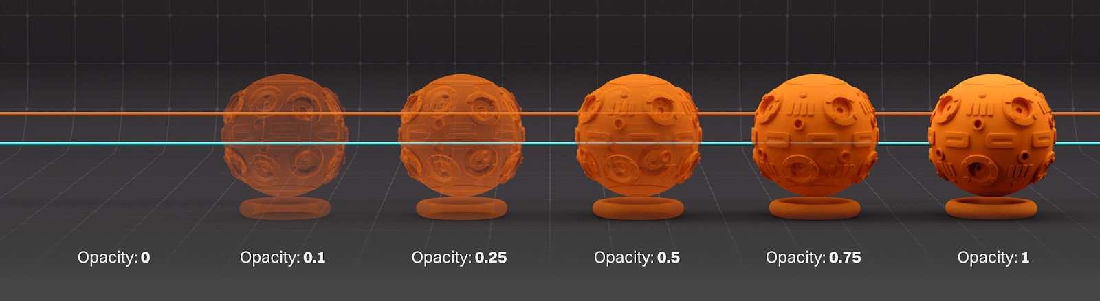 The Opacity Channel works similarly to the Opacity slider in Photoshop. This is very different from Transmission and isn’t used to create glass or translucent materials.
