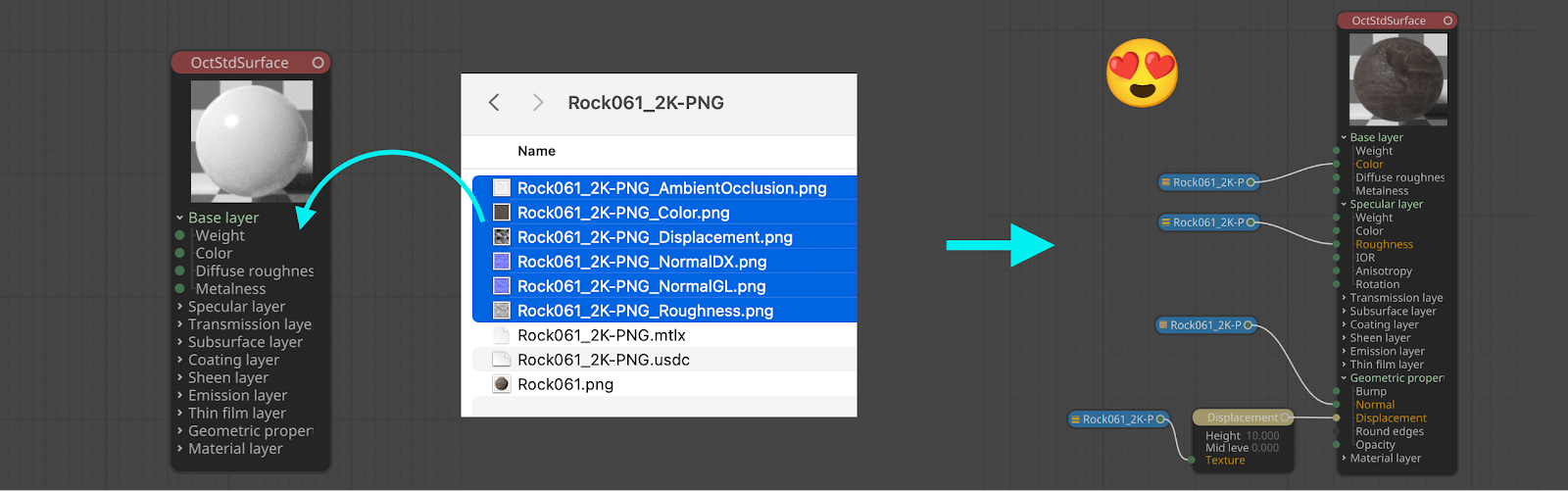 Even if only one texture in a folder is dragged in, Octane will look for others with a similar naming convention and bring them in as well.