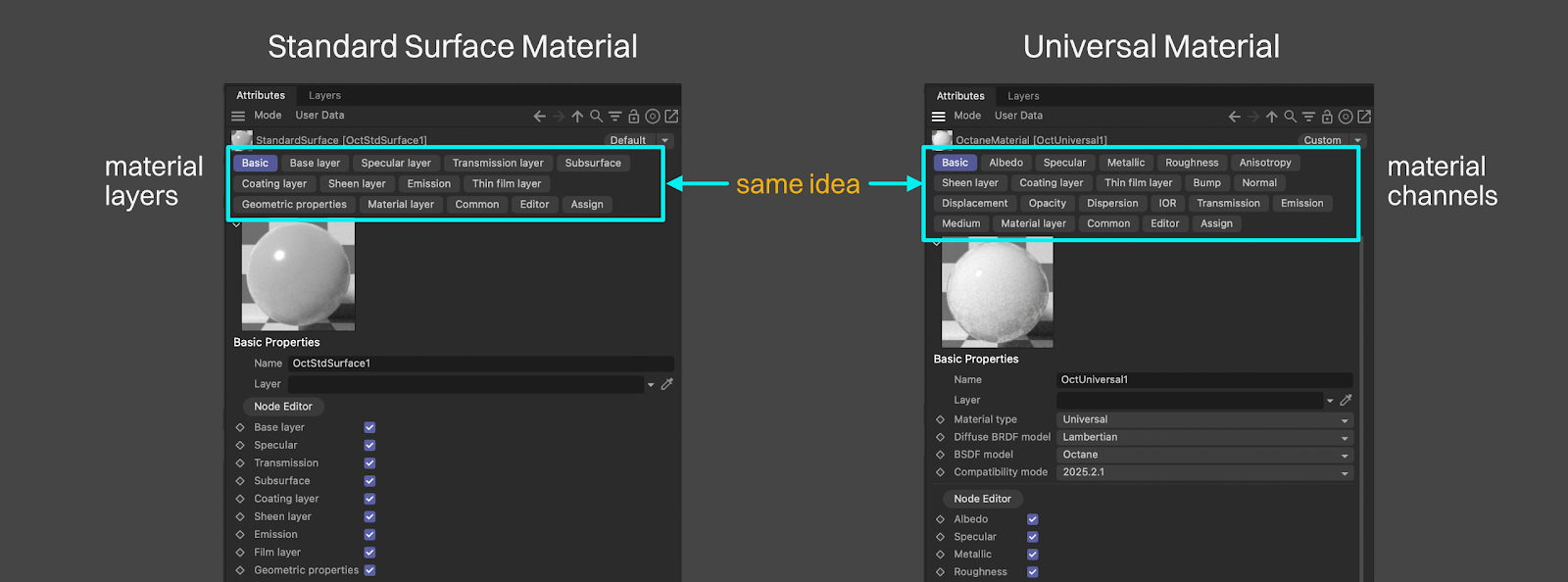 All materials in Octane (and most render engines) are broken down into buckets that each control a different aspect of the material. Most material types in Octane call these buckets “channels”, but the Standard Surface material calls them “layers” to keep with the naming of the original Autodesk material. It’s the same concept, just called something different.