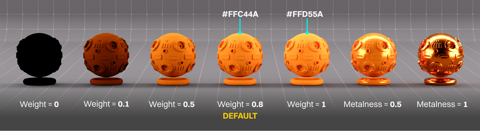The Base layer (channel) in the Standard Surface material primarily controls what we’d normally think of as the Diffuse or Albedo color. It also has Metalness (Metallic in the Universal/Metallic material) lumped in. The color controls affect both diffuse and metallic surfaces, similar to Artistic IOR mode in the Universal Material.