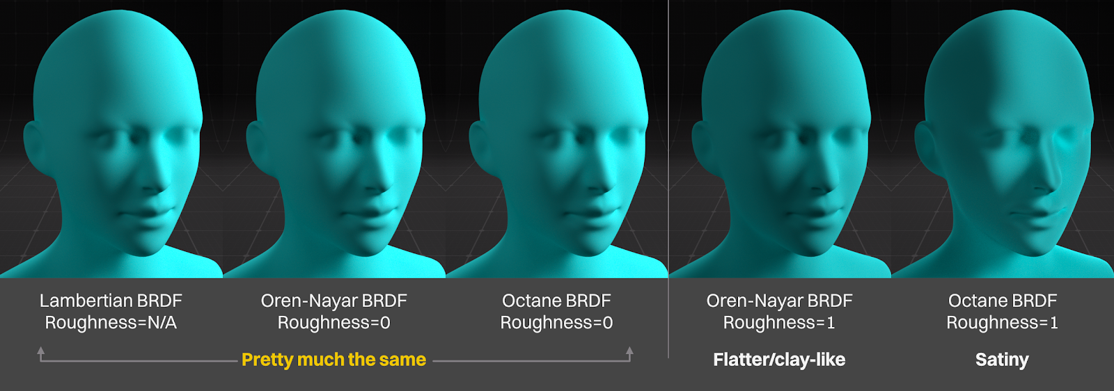 The other two models are more advanced and realistic. The Oren-Nayar model looks more flat and clay-like as the roughness goes up, while the Octane model looks more satiny. Oren-Nayar is the default mode and probably good for 90+% of the materials we’re going to make, but if we want something super satiny, Octane is a good choice.