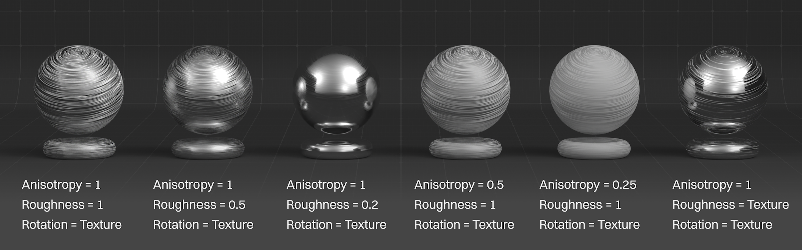 Anisotropic textures should be grayscale, ideally generated by an app that puts out linear texture maps. The texture usually goes into the Rotation input, but we can also feed it into the Roughness input or even the Anisotropy input to get different looks.