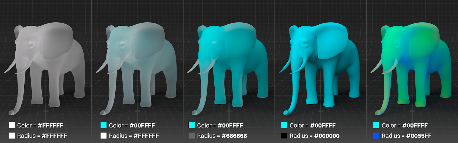 The Radius, if grayscale, controls how far into the model the light travels before absorbing and scattering: White goes all the way in and the look is more translucent like in panel 2 above, black scatters immediately and the the look is more opaque like panel 4 above.