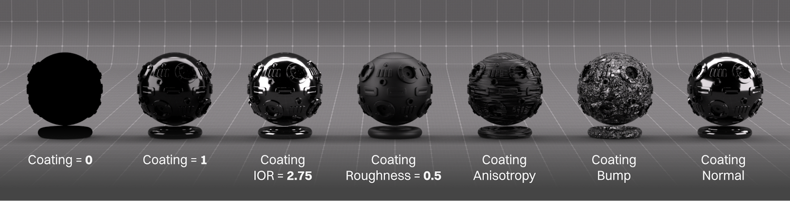 The Coating layer is basically another Specular layer that sits on top of everything else. It’s good for adding gloss to a material that uses Emission or Metallic properties (which override the Specular layer), or if we want our refractive IOR or roughness in a glass to be different than the reflective IOR. Coating has its own controls for roughness, anisotropy, bump, and normal that work the same way the regular versions of those controls work.