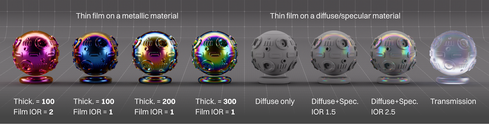 Film IOR controls how spread out the colors are, with 1 having a tight radial pattern toward the edges of the geometry and higher than that showing fewer of the colors in the spectrum.
