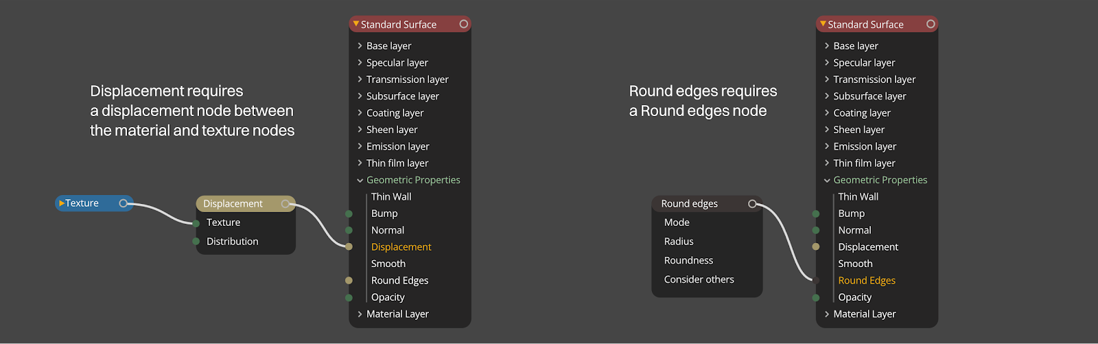 Both displacement and round edges in this section require special nodes in order to use those properties. Displacement uses a displacement node that allows us to choose either Vertex or Texture displacement. A texture then needs to be plugged into that to drive the height.
