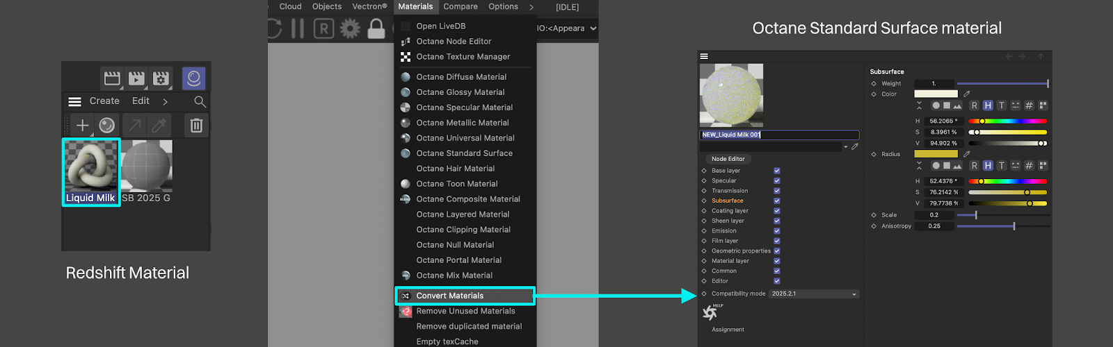 Since Redshift and Octane both use the Universal Material, it’s now possible to convert Redshift materials to Octane Standard Surface materials with varying levels of success.